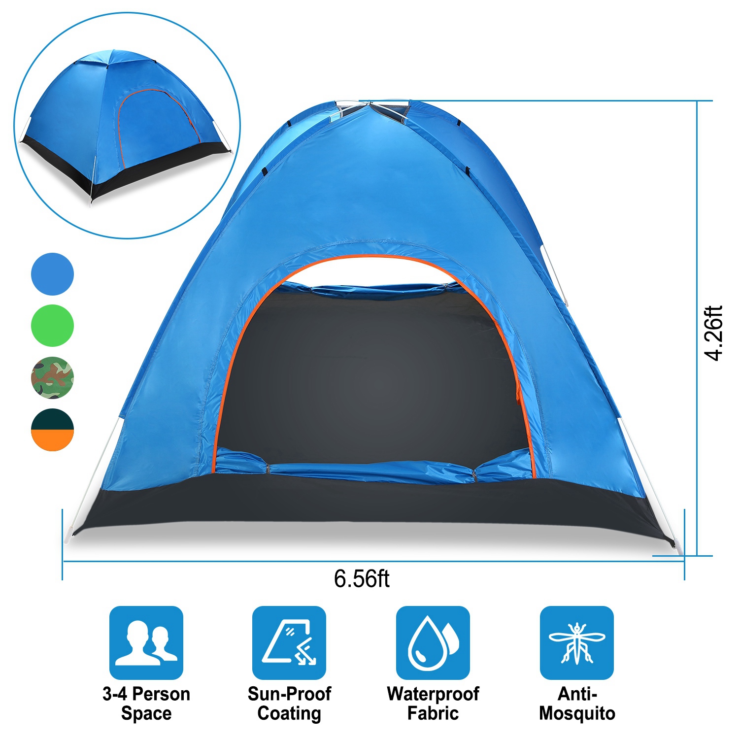 Our pop up tent which integrates with high-grade 170T coating polyester fabric body, moisture-proof oxford fabric floor pad and sturdy glass fiber frames is especially designed for various outdoor activities such as camping, hiking, fishing, self-driving tour, picnic, etc. Its unfolding size-6.56ft (length) x 6.56ft (width) x 4.26ft (height) provides large and spacious space to contain 3-4 persons (2-3 adults or 4 kids). And in order to better protect your privacy, create a more comfortable sleeping environment especially in summer, and ensure excellent air circulation, it is designed 2 symmetrical doors/windows with shade cloth and mosquito net to effectively block light, keep the inserts away and promote air flow. Additionally, it comes with a round carry bag to organize the folded lightweight (26.38in x 26.38in x 4.72in, only 3.04lbs) tent.