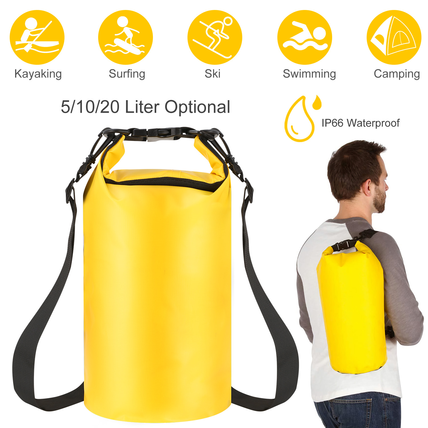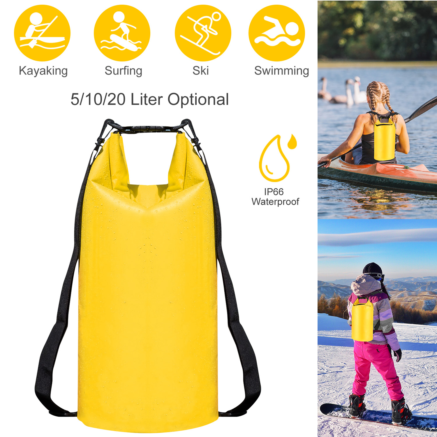 We believe that protect your valuables is crucial for keeping a good mood during your outdoor adventures. So our waterproof dry bag is designed to keep your stuff dry, clean, safe and protect them from sand, dust, mud and snow to ensure you enjoy outdoors without worry. Whichever adventure you are going on, such as kayaking, canoeing, snowboarding, skiing, hiking, camping, etc., our IP66 waterproof dry bag is the gear you can truly reply on. Made of waterproof 500D PVC material, which features IP66 waterproof, compact and durable and determines that it’s an essential part of your outdoor gear kit! Come with 2 detachable shoulder straps for your option to use as as backpack or shoulder bag, so you won't be fettered by anything else while having fun!