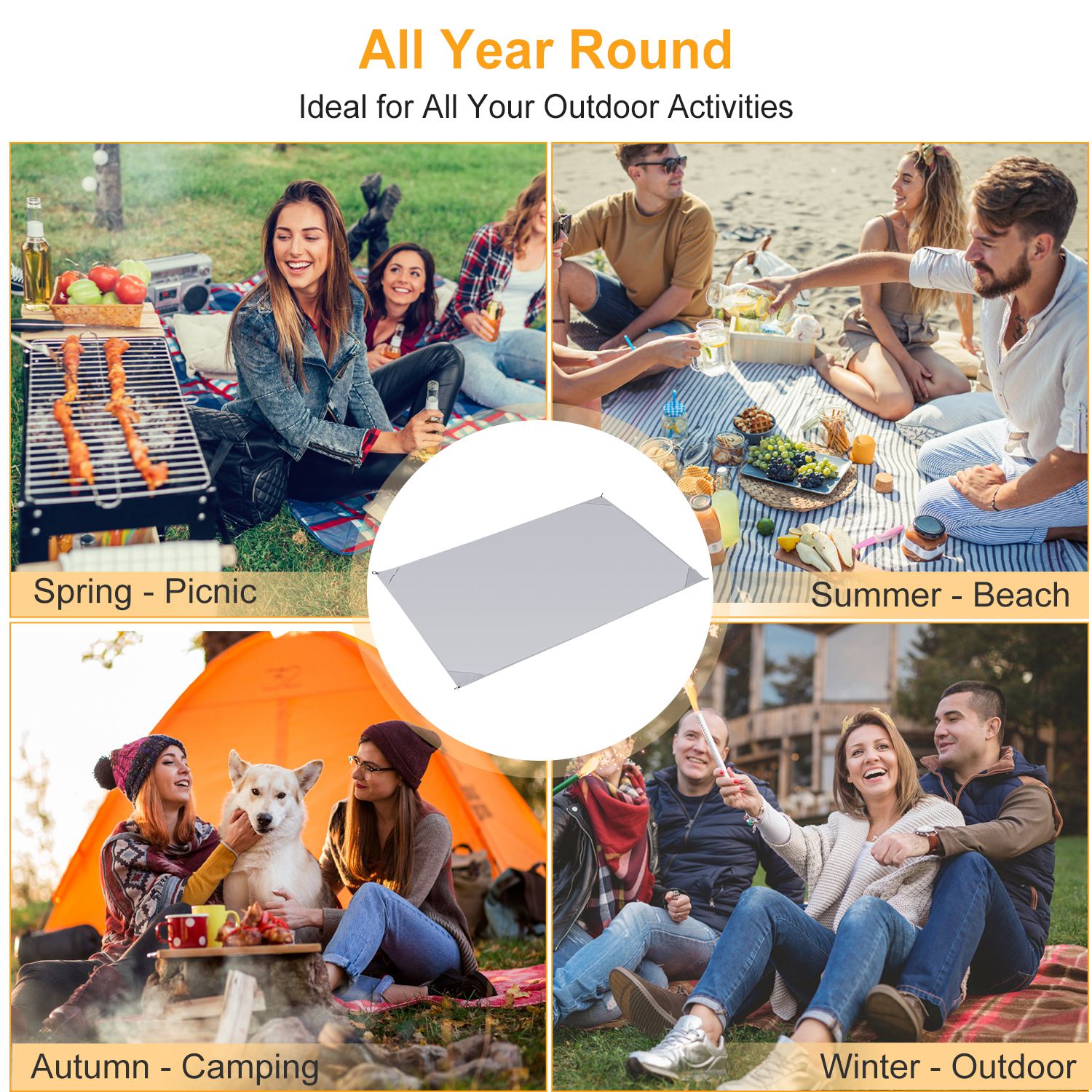 Our beach blanket extends to 4.6ft x 6.6ft, large enough to comfortably seat up to 6 adults and fold into a compact size of 5.9" x 3.9" x 1.8" for easy storage. Made of quality 210T Polyester which is strong, durable, lightweight and waterproof; NO WORRY about the sand sticking to the beach blanket and easy to get off the sand and brush off. Designed with 4 incorporated pockets and 4 stake loops to provide dual windproof protection. Perfect for picnic, camping, outing and beach travelling.