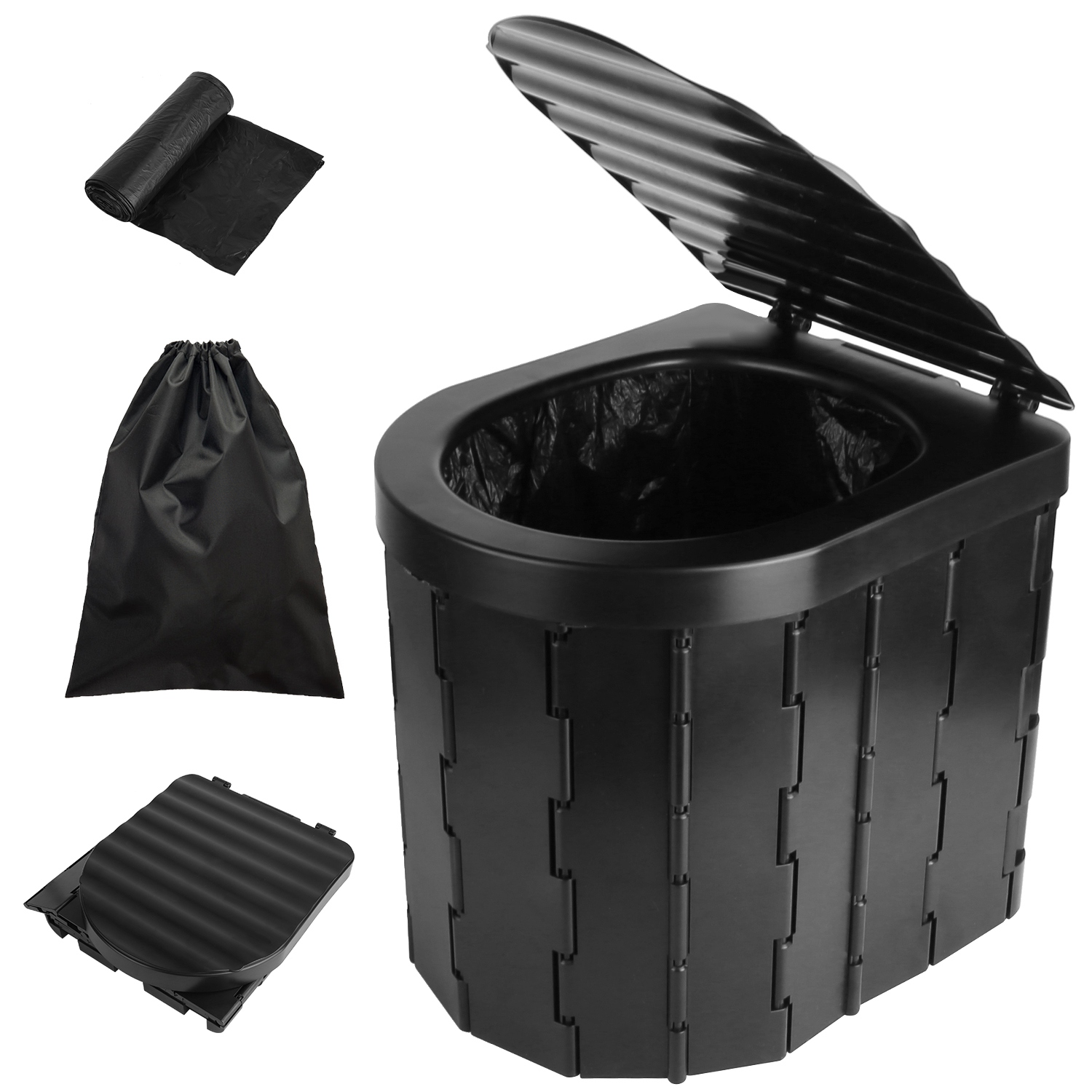 Home > Foldable Emergency Toilet Portable Porta Potty for Car Travel Camping Boating Hiking Cleanable Travel Commode with Lid Carry Bag 1 Roll Garbage Bags